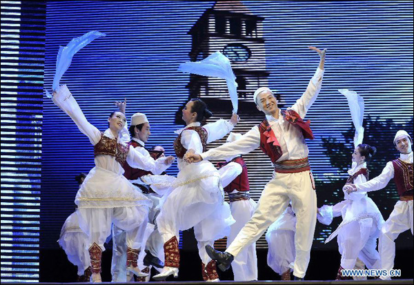 Kineski glumci izvode albanski narodni ples tijekom zajedničke izvedbe kineskih te albanskih umjetnika na Pekinškoj gala večeri u Tirani u ponedjeljak. (Xinhua/Wu Wei)