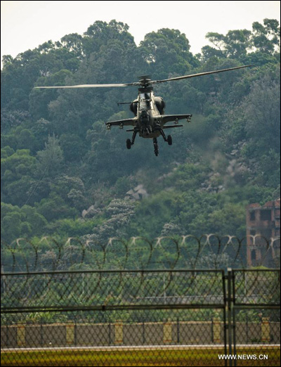 Vojni helikopter WZ-10 u probnom letu u Zhuhaiu, u pokrajini Guangdong na jugu Kine, 11. studenog 2012. Novi helikopter WZ-10 prvi put je predstavljen javnosti uoči 9. Kineske međunarodne izložbe avijacije i aeronautike otvorene u Zhuhaiu u utorak. (Xinhua/Yang Guang)