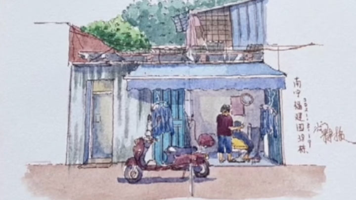 Ovaj mladić je učitelj tehnike slikanja akvarelom iz Guangxija. Voli koristiti akvarel za slikanje gradskih krajolika. Stambene zgrade i male trgovine uz cestu su inspiracija za njegovo stvaralaštvo. U njegovim djelima, ove obične zgrade izgledaju vrlo živo.