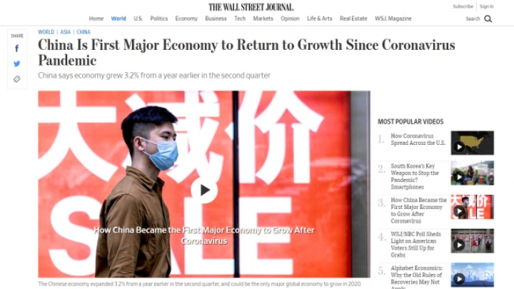 Prema podacima Nacionalne uprave za statistika Kine objavljenim 16. srpnja je u prvoj polovici ove godine kinesko gospodarstvo od negativnih pokazatelja i pada u prvom tromjesečju, ostvarilo pozitivne pokazatelje i uspon te je u drugom tromjesečju rast kineskog BDP-a iznosio 3,2%, uz oporavak drugih glavnih pokazatelja.